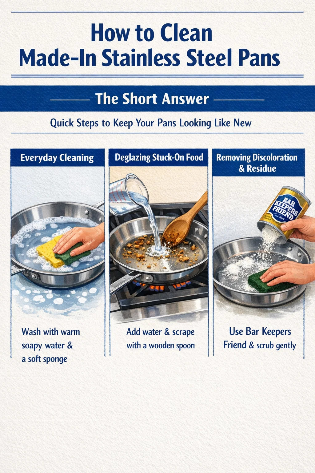 Voor de dagelijkse schoonmaak, was uw Made-In roestvrijstalen pan onmiddellijk nadat deze is afgekoeld met warm zeepsop en een zachte spons . Als er voedsel vastzit, blus de pan dan terwijl deze nog warm is door water toe te voegen en met een houten lepel te schrapen. Voor verkleuringen of hardnekkige resten kunt u een pasta van Bar Keepers Friend en water gebruiken, voorzichtig schrobben en grondig afspoelen. Dat dekt 95% van wat je ooit met deze pannen zult tegenkomen.
