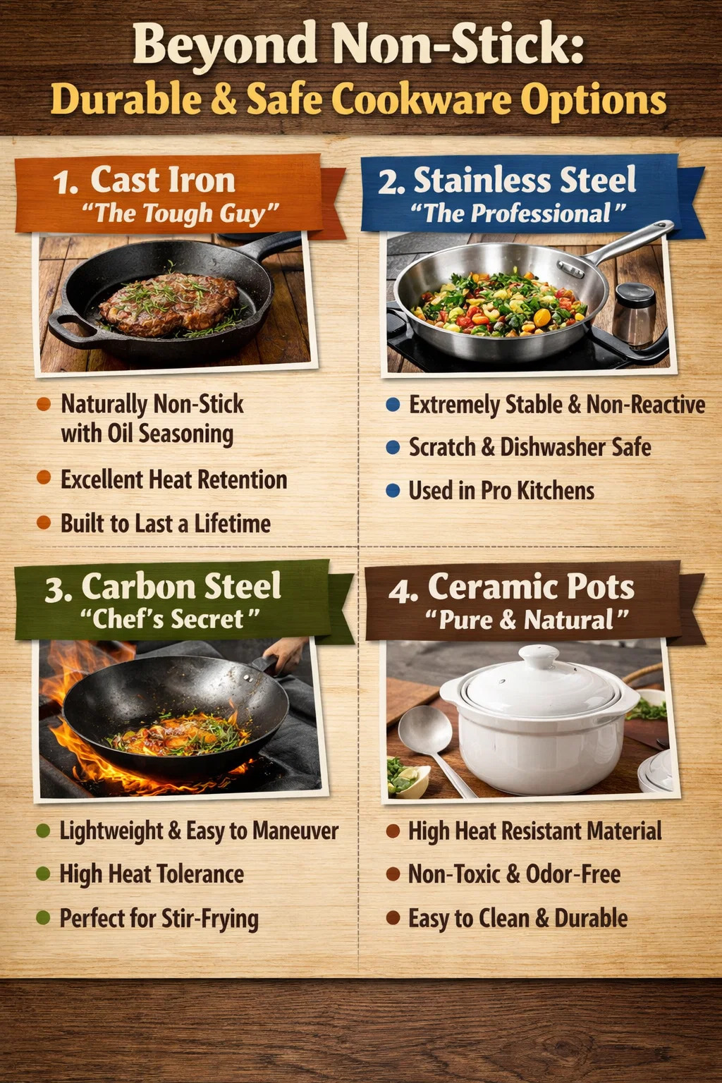 Terwijl het modern is kookgerei met antiaanbaklaag is veilig bij normaal gebruik. Als u op zoek bent naar kookgerei dat volledig zorgeloos is, zonder zorgen over afbladderende coating of problemen met hoge temperaturen, zijn er inderdaad verschillende robuustere en betrouwbaardere alternatieven.