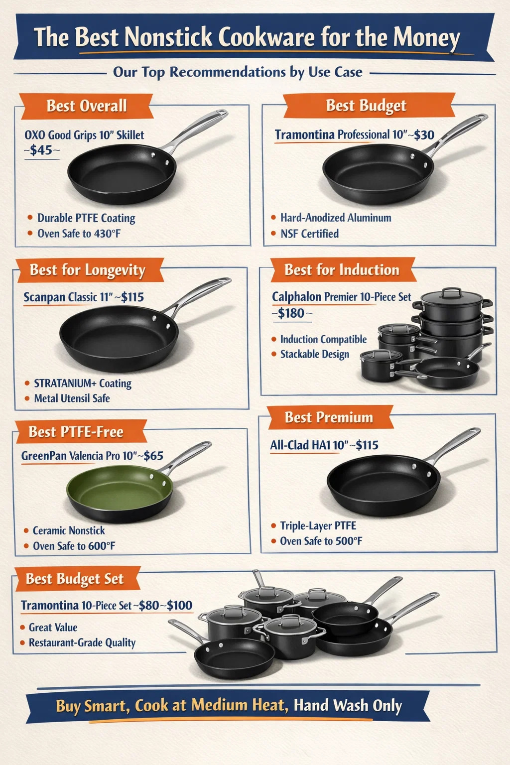 Voor deze prijs is het doel het ergste te vermijden: dunne coatings die binnen een jaar afbladderen, handvatten die na een maand wiebelen en bases die kromtrekken bij hoge temperaturen. Het veld wordt gedomineerd door T-fal-, Rachael Ray- en budget Cuisinart-lijnen die meestal teleurstellen. Twee opties springen er echt uit: