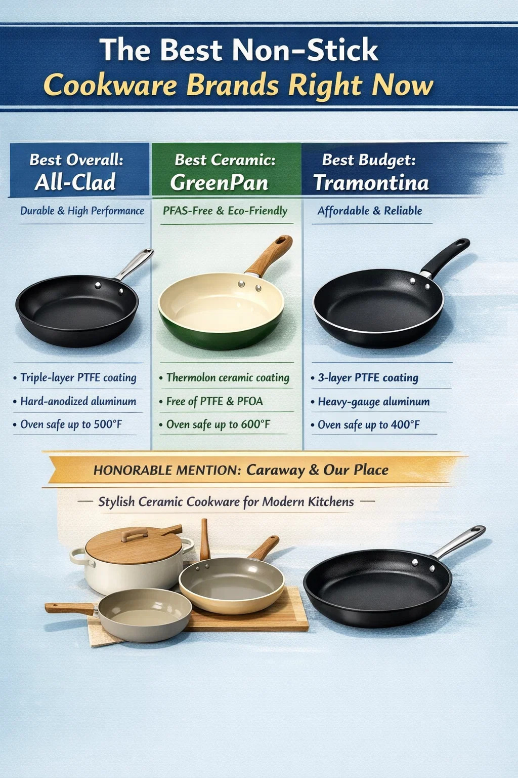 - Beste merk voor non-stick kookgerei: All-Clad - beste balans tussen duurzaamheid, warmteprestaties en langetermijnwaarde voor serieuze thuiskoks.