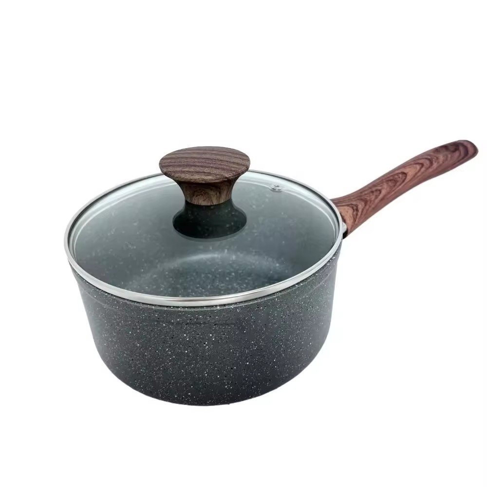 Thuis / Product / Sauspan / Melkpan / Geperst aluminium marmer gecoate sauspan met houten handvat